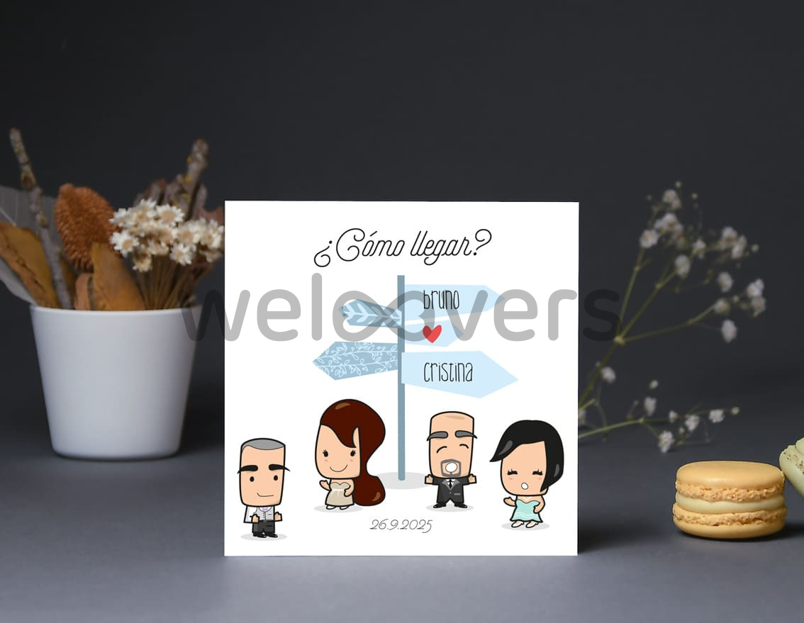 Manteniendo el estilo weloover de tus invitaciones, el tarjetón incluye un pequeño mapa con indicaciones especialmente pensado para facilitar la llegada a los invitados al evento.
