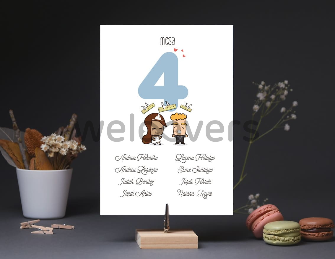 Tarjetones numerados y personalizados con los weloovers y la lista de invitados que se sentarán en cada mesa.