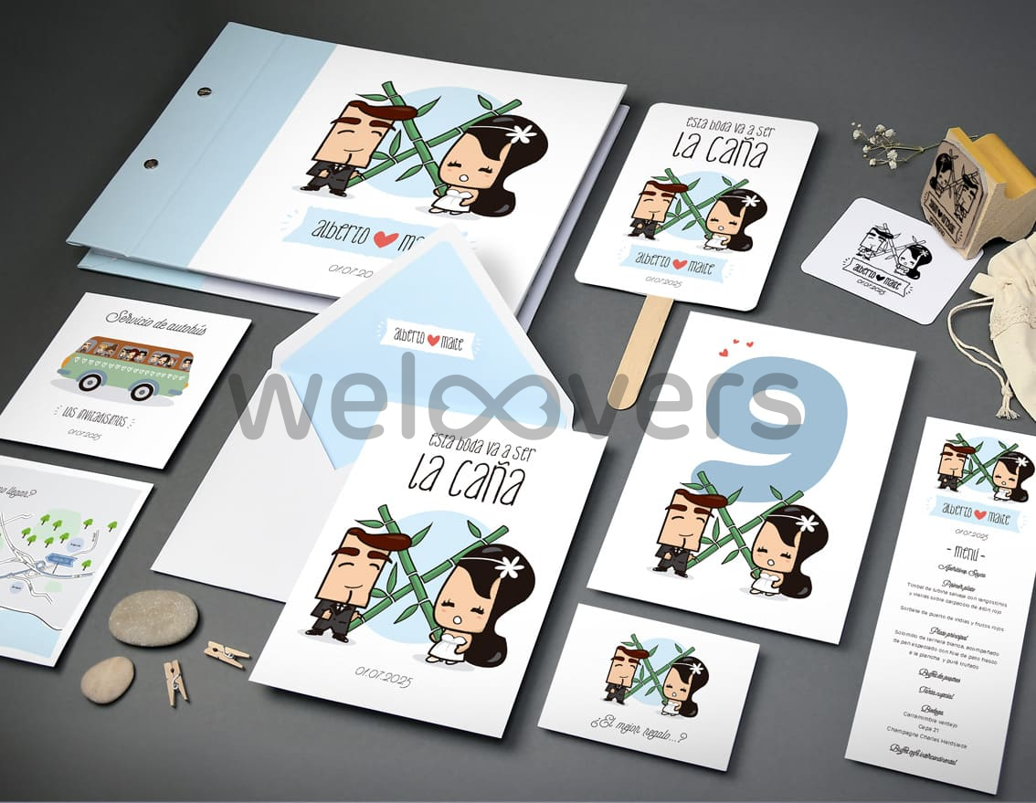 También podemos diseñar otros elementos de tu boda con el mismo estilo (tarjetas de gracias, mapa de llegada, servicio de bus, números de mesa, pai pai, sello, libro de firmas, laminas...)